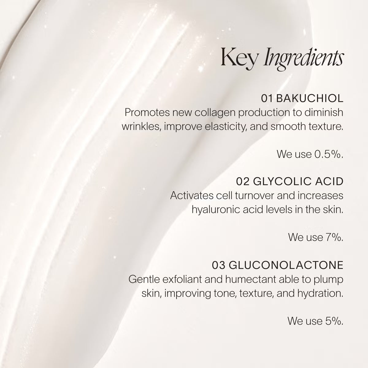 Aqua/Water/Eau, Squalane, Glycolic Acid, Butyrospermum Parkii (Shea) Butter, Sodium Hydroxide, Gluconolactone, Cetearyl Olivate, Sorbitan Olivate, Leuconostoc/Radish Root Ferment Filtrate, Lactobacillus, Cocos Nucifera (Coconut) Fruit Extract, Cetearyl Alcohol, Arachidyl Alcohol, Behenyl Alcohol, Arachidyl Glucoside, Bakuchiol, Jojoba Esters, Vanilla Planifolia Fruit Extract, Allantoin, Xanthan Gum, Tocopheryl Acetate